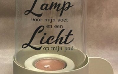 Dit sfeerlicht met met waxine kaarsje is gemaakt van glas en versierd met een mooie tekstopdruk 'Uw Woord is een lamp voor mijn voet en een Licht op...