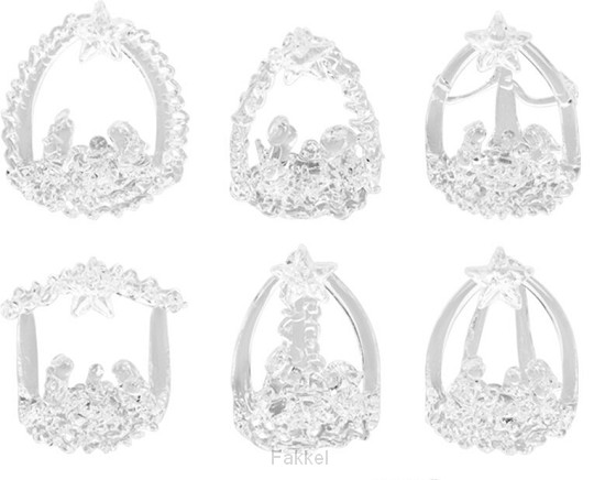 Kerststal glas hangdeco 6 assorti leverbaar per stuk op klein karton. Afmeting: 6x5x7,5cm
