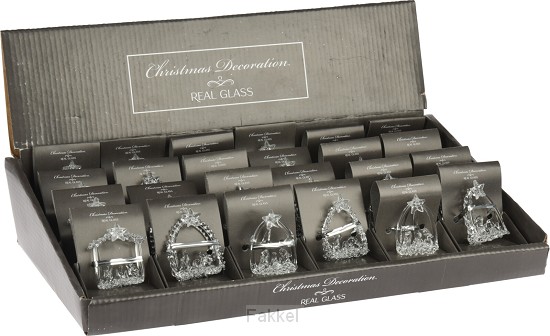 Kerststal hangdeco display (24) 6 verschillende designs. Elk stuk op klein karton. Afmeting: 6x5x7,5cm