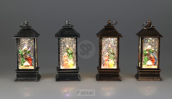 Lantaarn met Heilige Familie. Afmetingen: 5,3 x 5,3 x 13 cm. Met water en glitter erin.