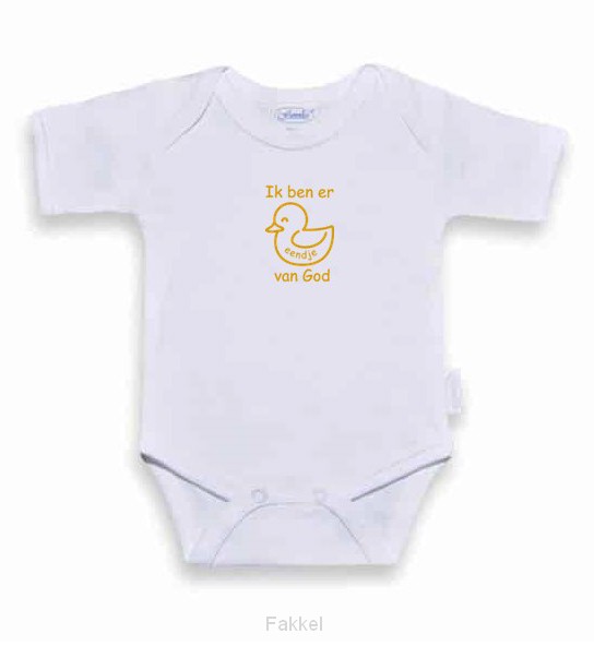 Baby romper kleur wit, maat: 62-68, Materiaal 100% katoen. Tekst:Ik ben er eendje van God.